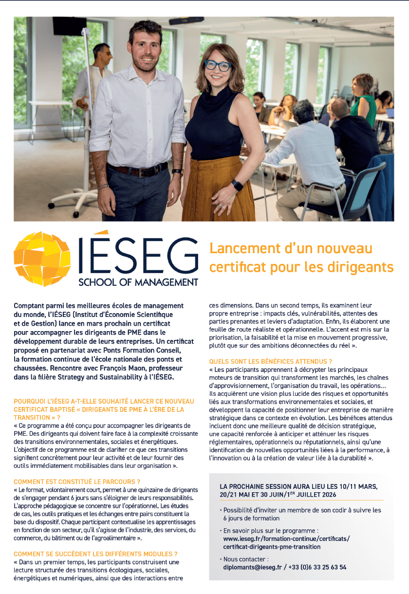 Starting in March, IÉSEG is launching, in partnership with Ponts Formation Conseil – the continuing education arm of the École nationale des ponts et chaussées – a certificate programme dedicated to supporting SME executives in the sustainable development of their companies.